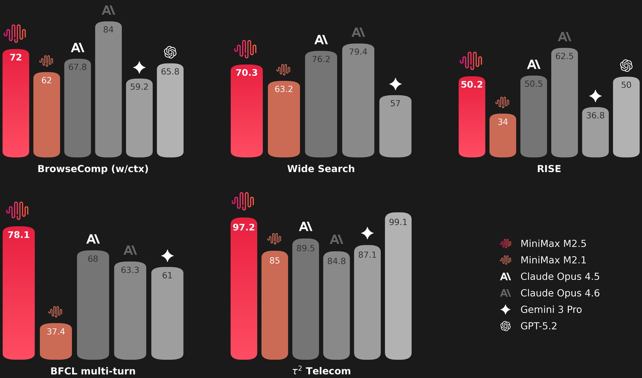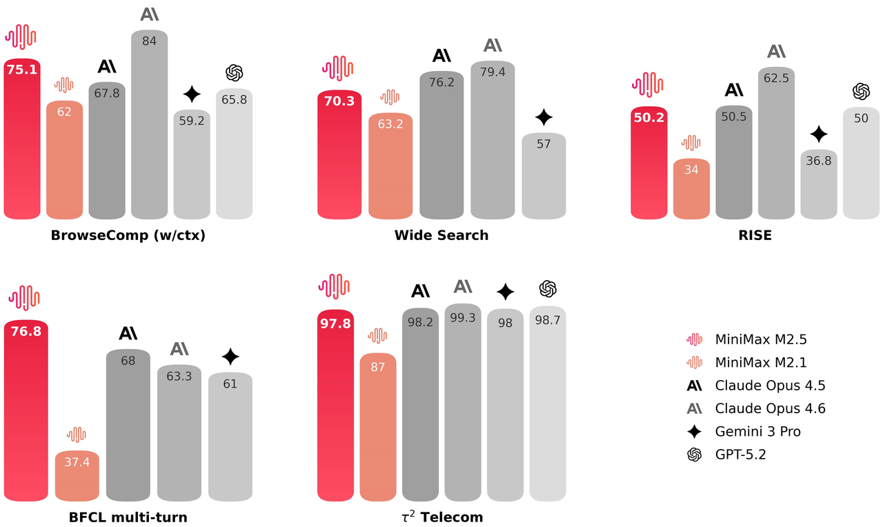 Extensively trained with reinforcement learning in hundreds of thousands of complex real-world environments, M2.5 is SOTA in coding, agentic tool use and search, office work, and a range of other economically valuable tasks, boasting scores of 80.2% in SWE-Bench Verified, 51.3% in Multi-SWE-Bench, and 76.3% in BrowseComp (with context management).